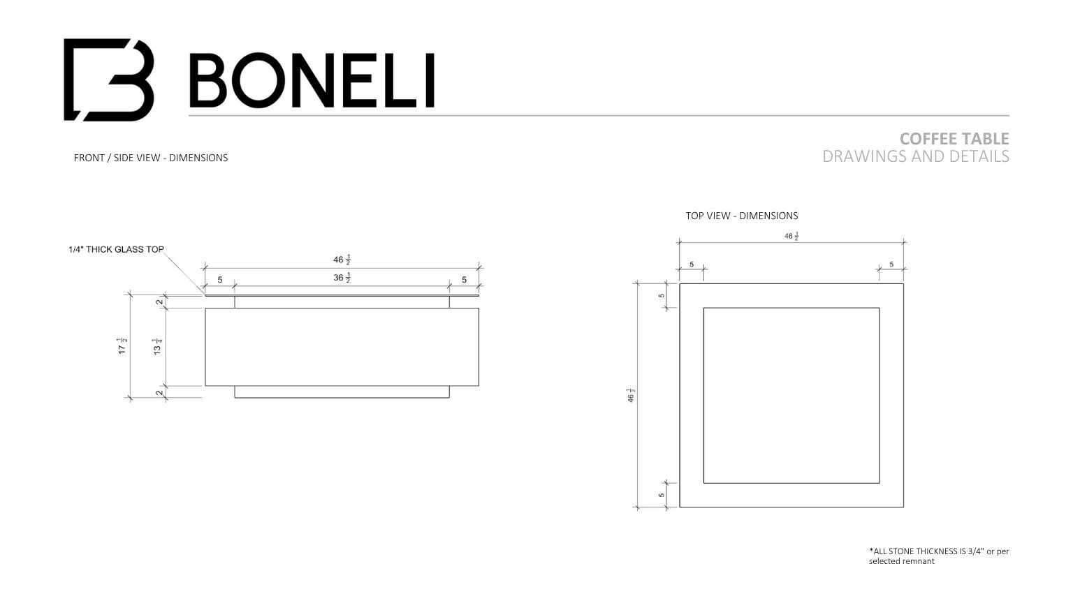 Please note that this table does not include the top glass; only the marble parts are included. Please note that the gross measurement is 17.5" with your added glass. Please see the actual drawings for specifics. Edges to be 45 mitered.