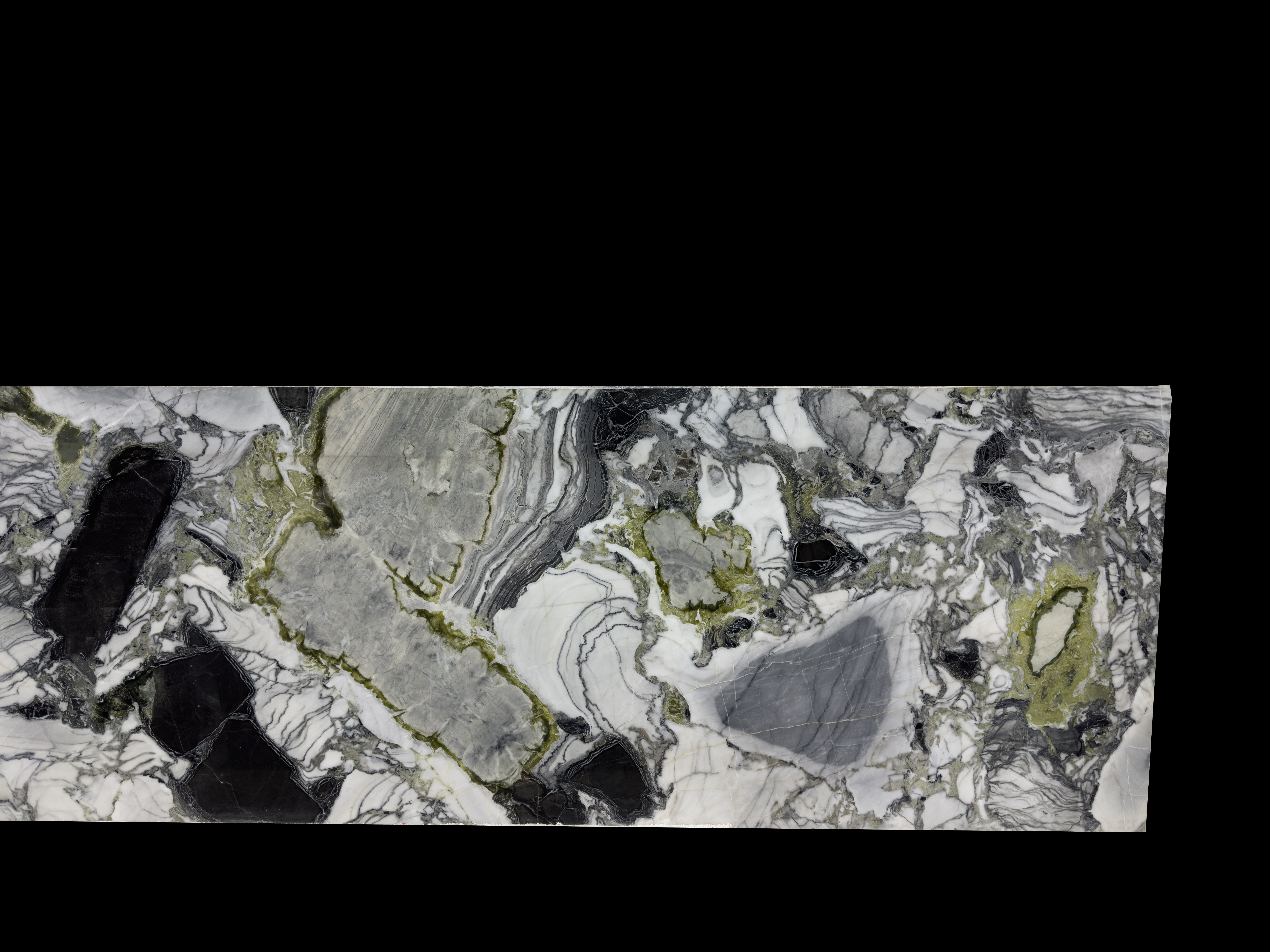 White Cliff is a rare marble with white, black, green, purple range of colors.